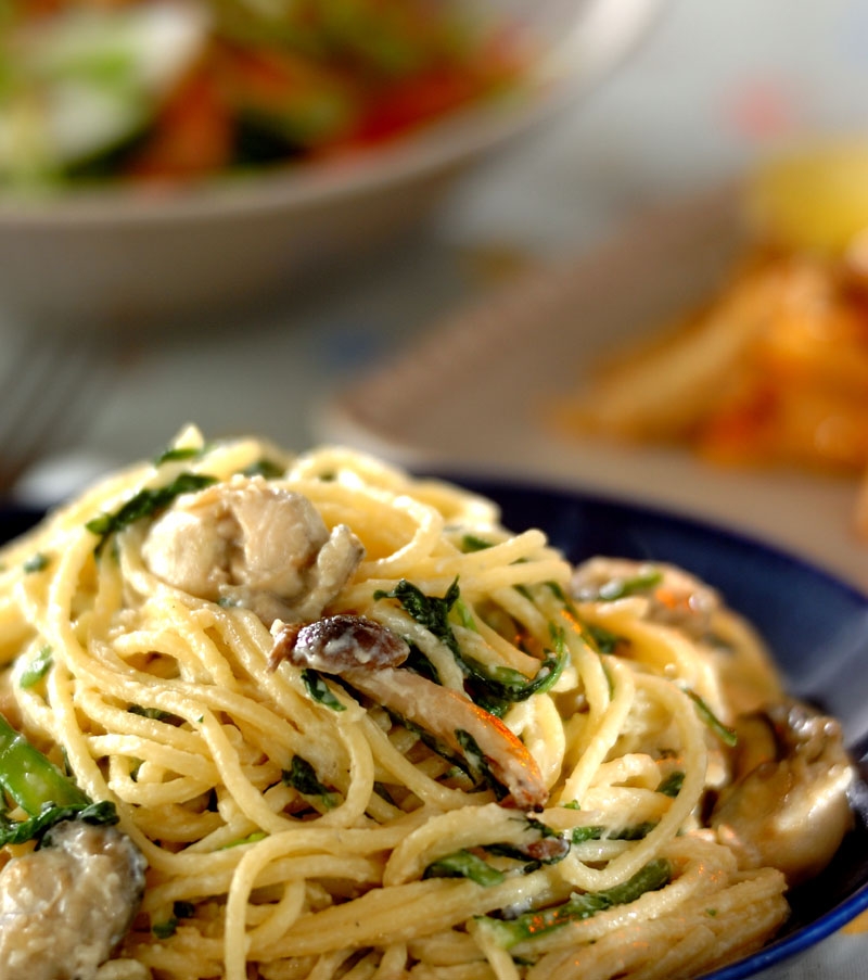 カキと乳製品の相性は抜群! 副菜はコリコリッとした食感がおいしい軟骨を添えて。