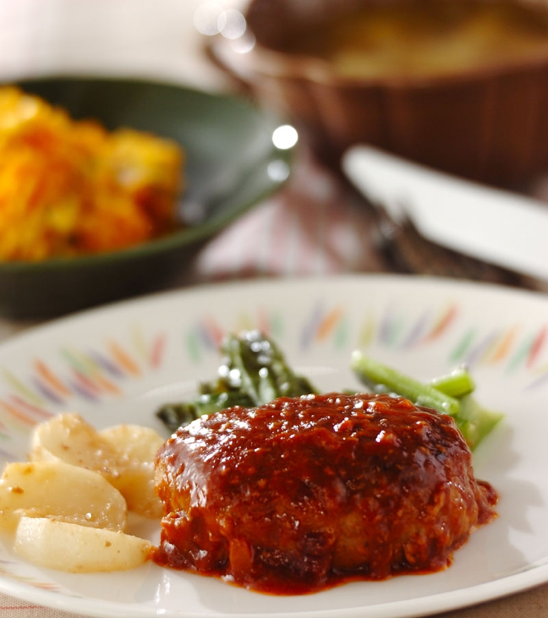 今日はご馳走だね、の声が聞こえてきそう。家族が大好きなおうちのハンバーグに、バランスよく副菜を組み合わせます。