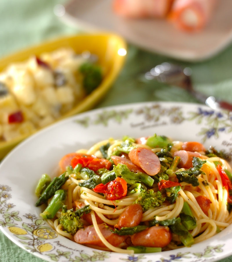 いつものレシピに菜の花やリンゴを取り入れて、ちょっとオシャレな食卓に。