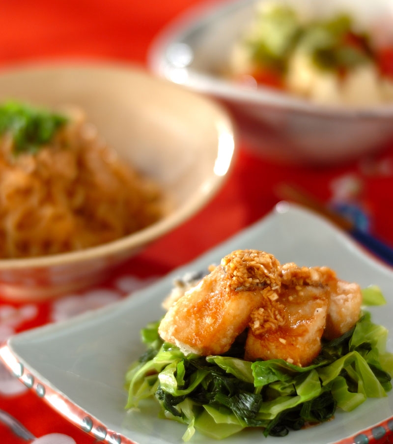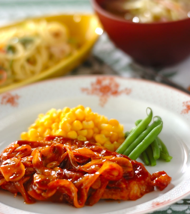 ご飯もパンにも合うポークチャップをメインに、簡単にできる副菜2品の組合せ。