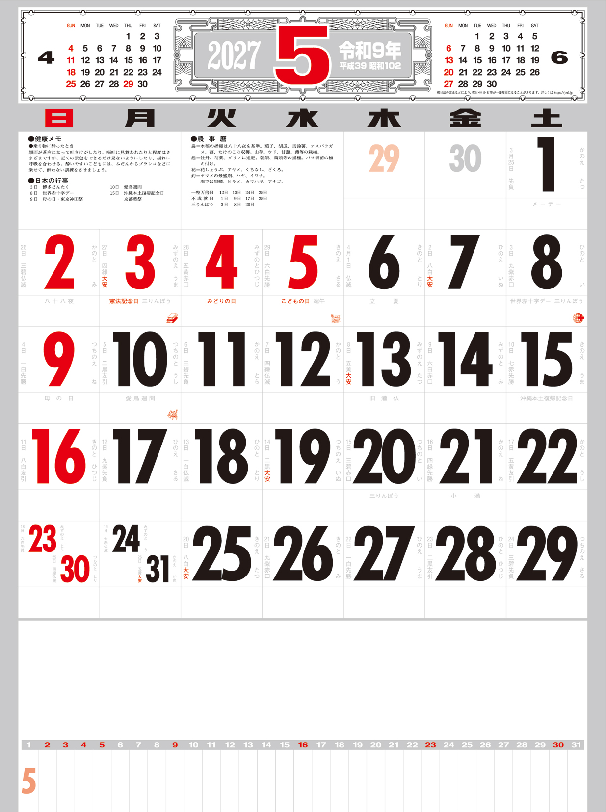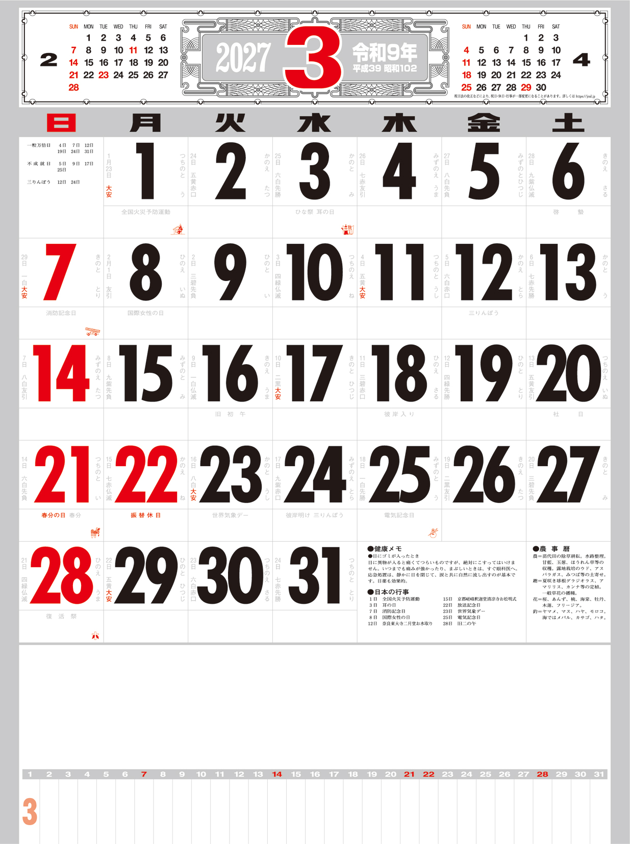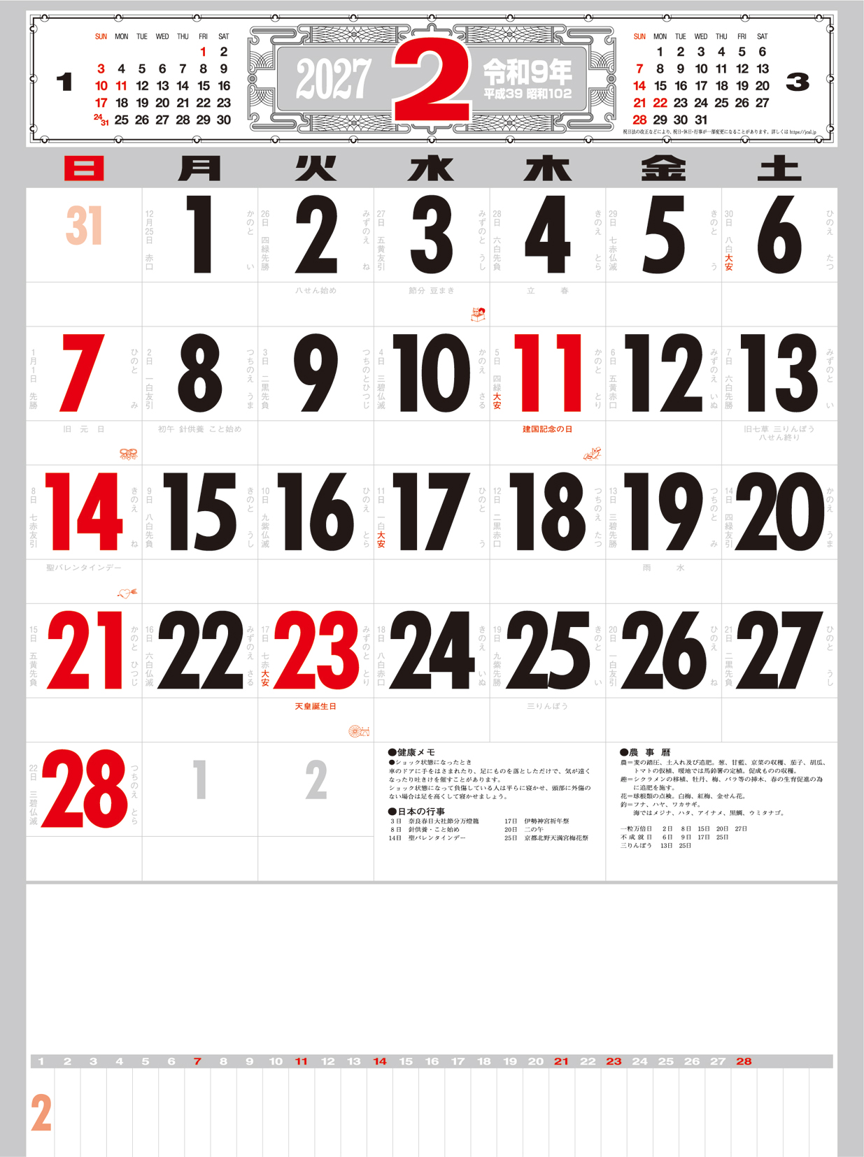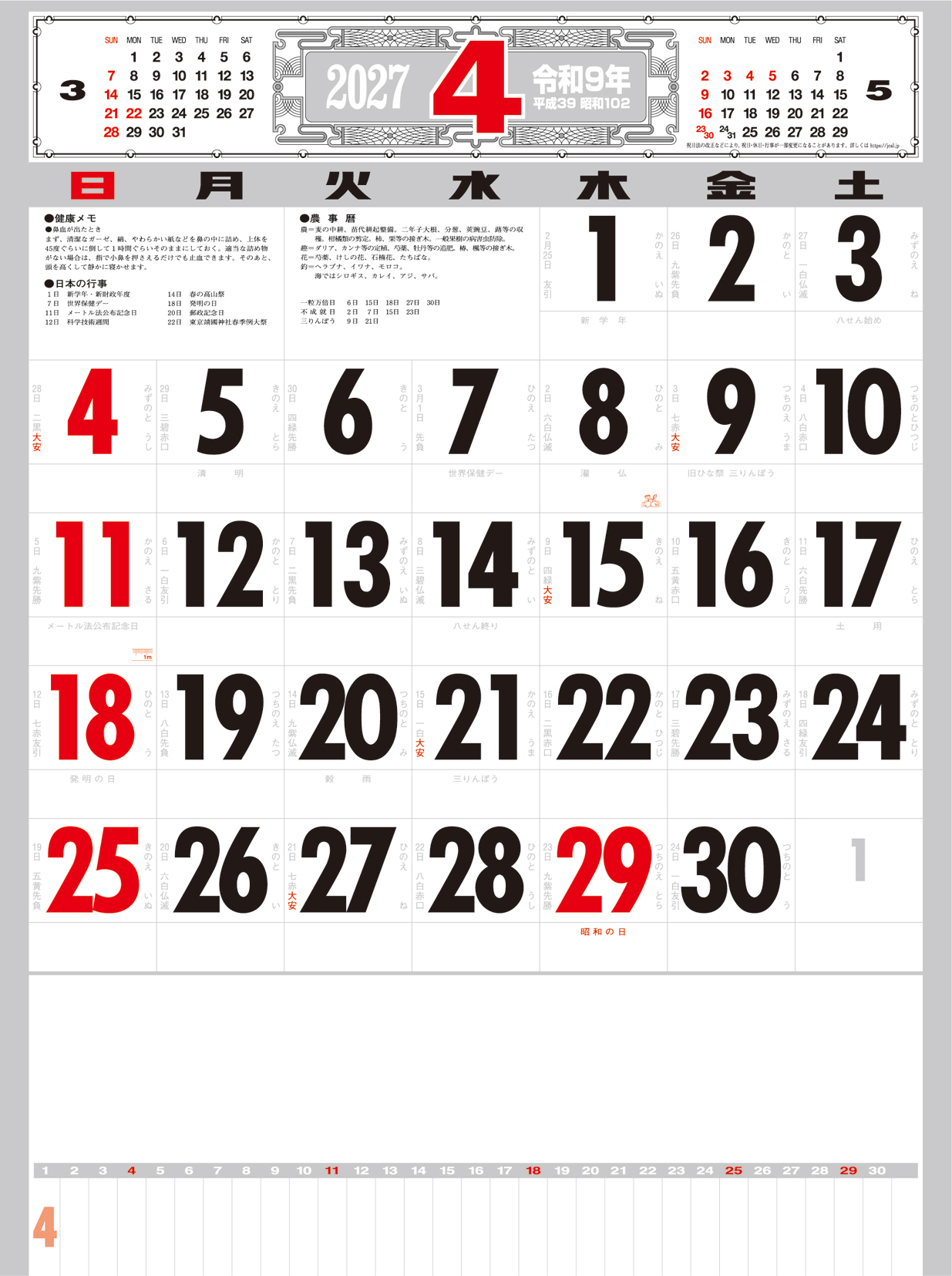 厚口文字月表 晴雨表入り・年間予定表付