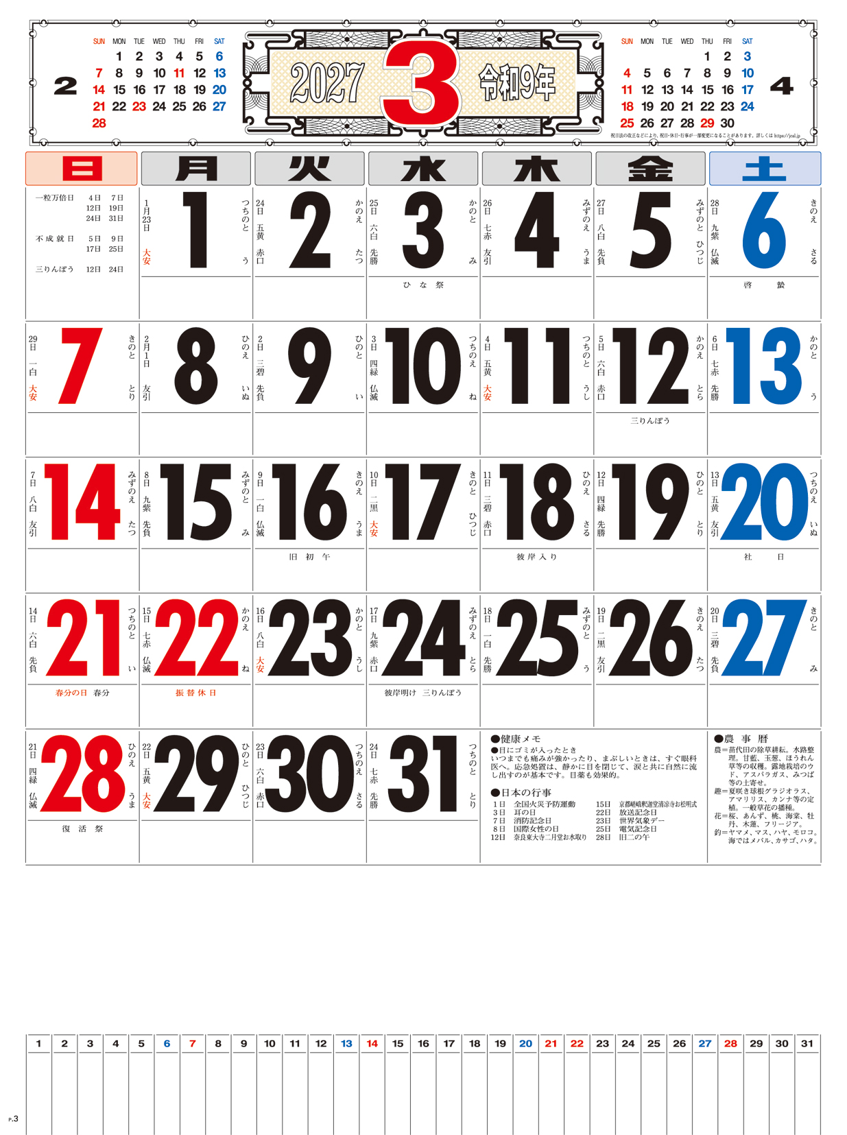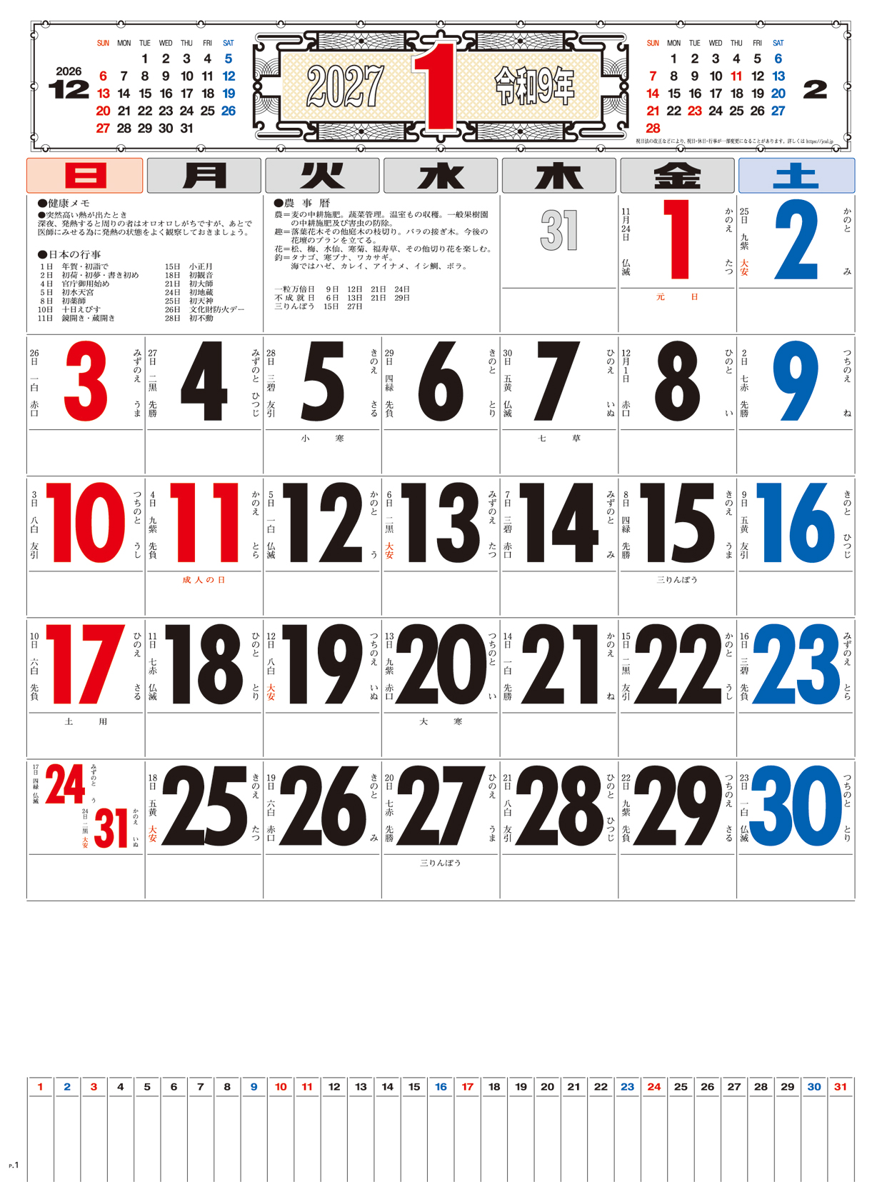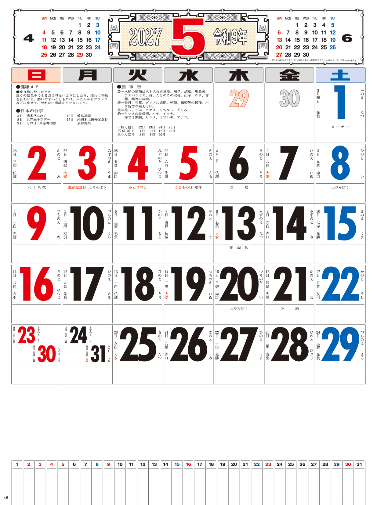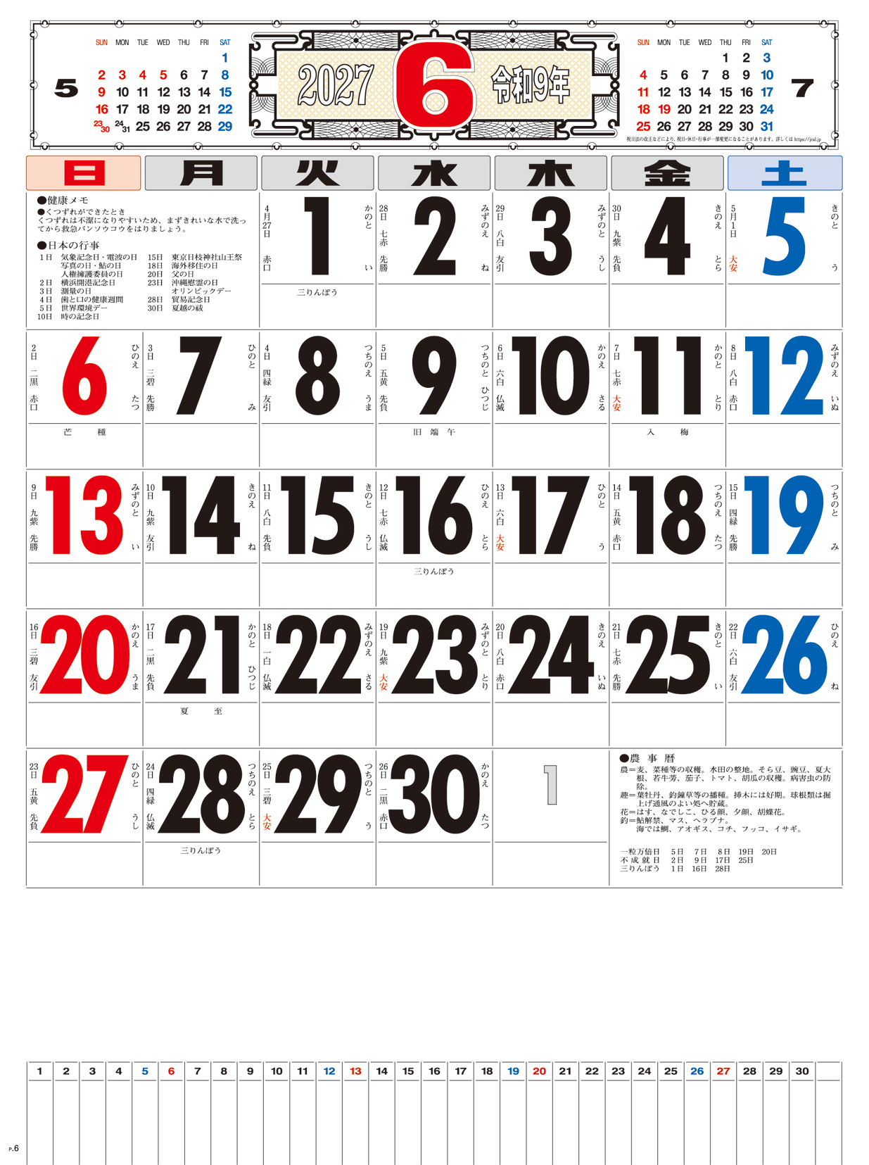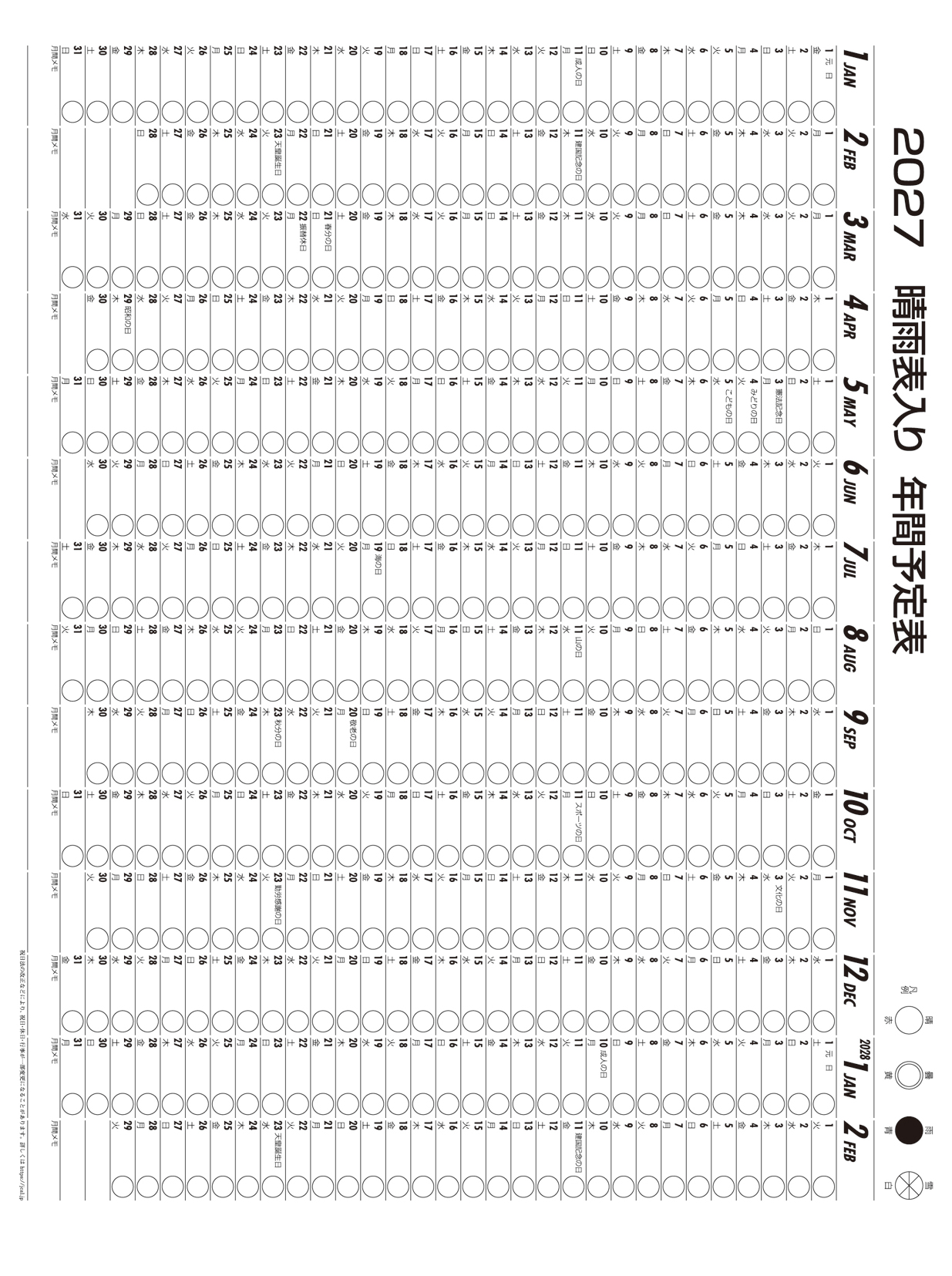 メモ付文字月表 晴雨表入り・年間予定表付