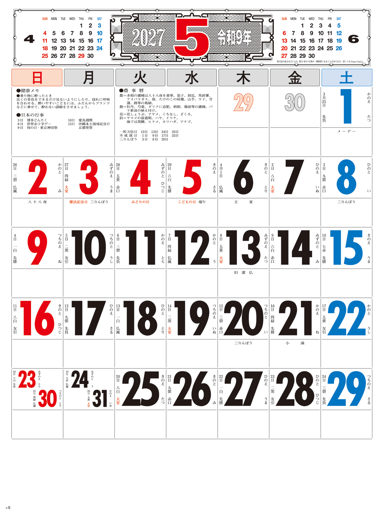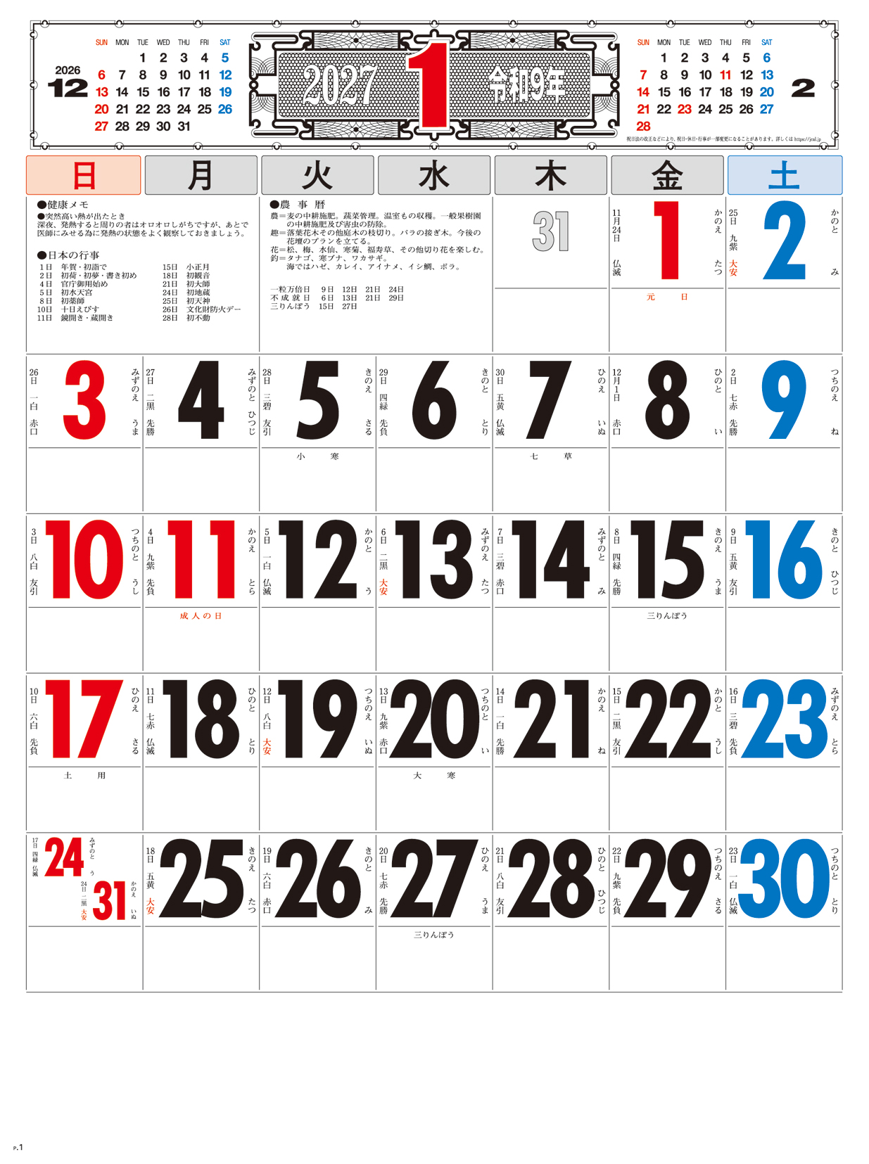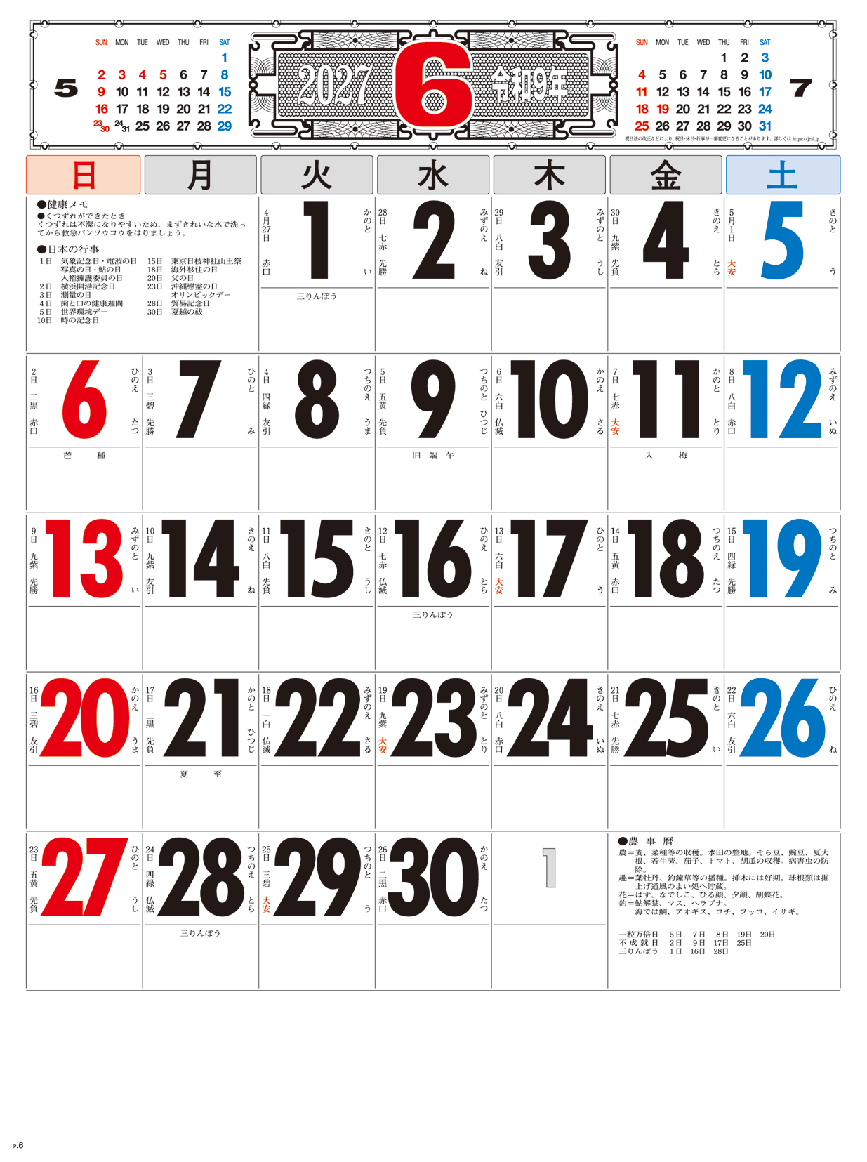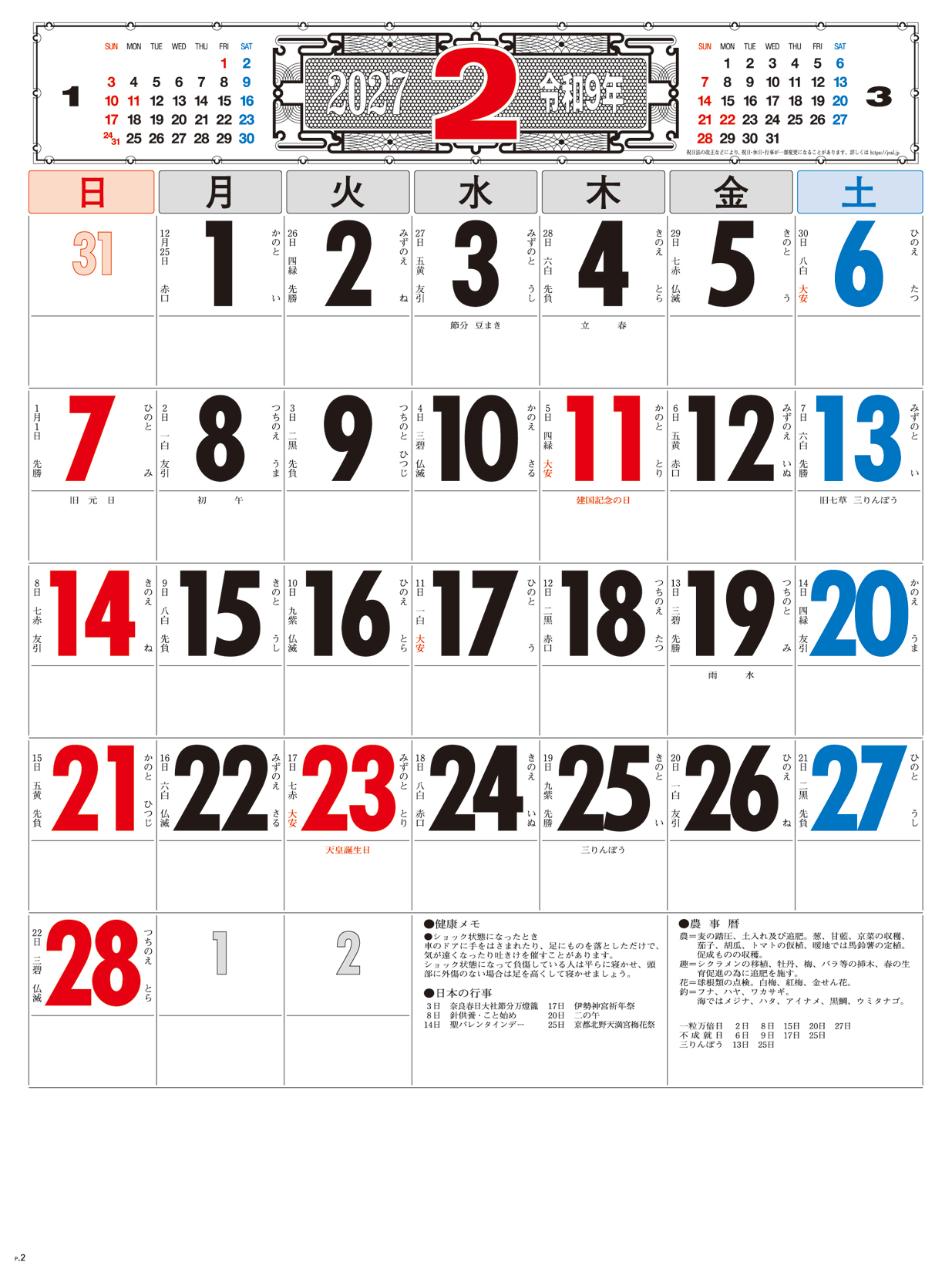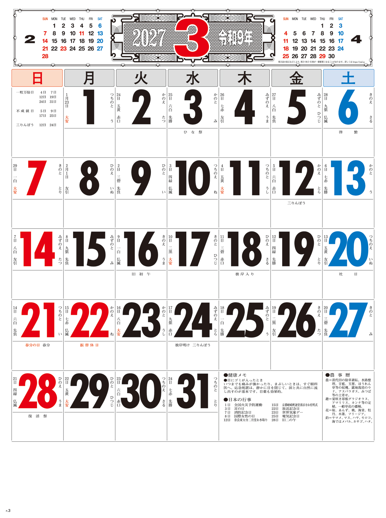 3色文字月表 晴雨表入り・年間予定表付