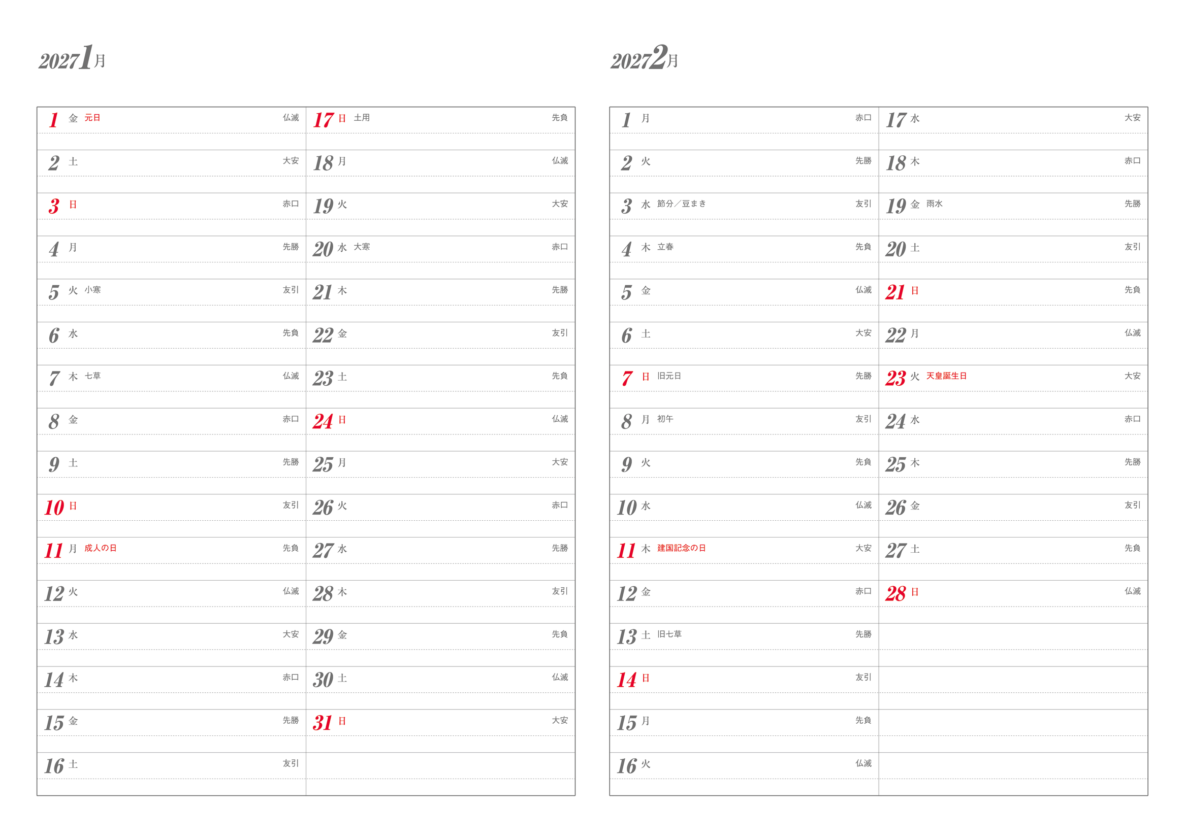 ※月間スケジュールに六曜を掲載しています。